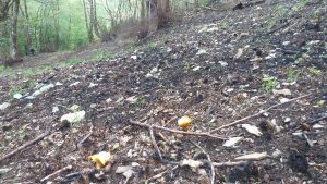 Las setas cantharelli, que como hemos venido diciendo tienen un estómago de lo más agradecido, aún sobreviven en los terrenos de este tipo de propietarios bastante enojosos. Aunque por mayo la superficie esté bastante pelada de detritos orgánicos (que no de guantes de goma, botellas de cerveza o envoltorios de bocadillos), el micelio entre las raíces de los árboles que con amor plantaron los antepasados de esta gente aún debe estar sano y por eso, por un poco de dignidad o esperando tiempos mejores, se diría que las setas todavía aparecen, eso sí más pequeñas y engurruñadas de lo que deberían. En resumidas cuentas, las cantharelli se llevan mal, pero conviven, con los capitalistas obreros.